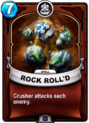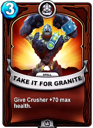 Crusher attacks with his large, menacing hammer (also named Crusher) and his secondary attack, shooting eye beams that turn enemies to stone. He can also self-destruct to scatter his rocky parts, but has the ability to reform. In Skylanders: Battlecast, he can also change his composition to endure more attacks or raise his attack. His Special Ability is Golem's Strength, increasing his power, and his signature Gear is his father's hammer, aptly titled My Father's Hammer, which corresponds to his Hammer Daddy console upgrade and doubles his damage.