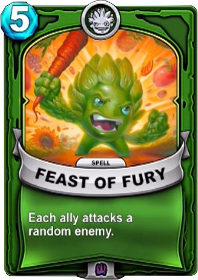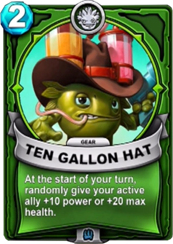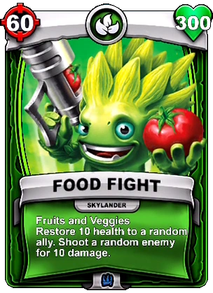Food Fight has the ability to replant himself to spawn exploding artichokes, and shoot zucchini and tomatos from his gun. In Skylanders: Battlecast, he has the ability to also shoot grapes from his weapon, and summon large quantities of food to replentish and power up his allies. His Gear is a Ten-Gallon Hat, allowing the active fighter to heal and power up without using additional spells, and his special ability is Fruit and Veggies randomly attacking foe and healing ally.