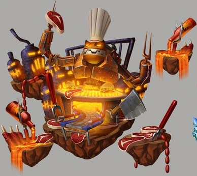 Grill-X's Big BBQ is the fifth land race track in Skylanders: SuperChargers Racing. It is also the final track in the main game and only appears in the Magnificent Tour. As the name implies, the track is held on a giant BBQ that is being worked on by Grill-X, possibly a recreation of Drill-X. There are several oversized portions of meat, including sausages and chops, and parts of the track are covered in boiling hot ketchup. There are also several meat cleavers that can cut the players path off and force them to take another route.