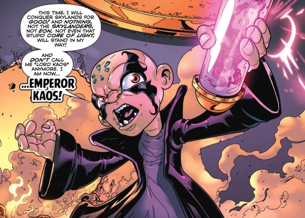 In Imaginators, Kaos gains full control over Mind Magic, allowing him to bring his thoughts to life, and uses it to create true Doomlanders. However due to Kaos' low intelligence, he is unable to use Mind Magic to its full potential, his Doomlanders aren't invincible as he envisions them, and many have odd, unplanned personalities. Eventually Kaos and Brain combine their Mind Magic powers, gaining vast powers to warp reality and mind control over most of Skylands. During the final battle, Super Kaos is created from Brain's power, giving him the power to create fields of energy that repel and damage the Skylanders, as well as let him create entire teams of Doomlanders on a whim.