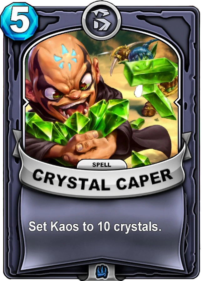 In Skylanders: Battlecast, Kaos can, in a word, cheat in many mechanics of the game. He can make crystals rain from the sky, setting himself to maximum energy, summon a special Stupendous Stink Bomb that acts as a Relic but cannot be destroyed the same way, randomly destroys and gains Gear and Relics, and uses Portals to swap in random villains temporarily. Notably, in his final battle at the Kaos Realm, he will hide as a random hologram, being able to be attacked before revealing himself.