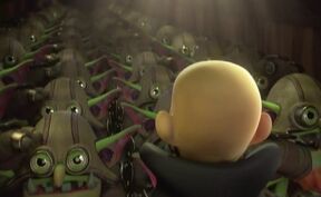- Possibly as a reference to the infamous Invader Zim episode "Dark Harvest",in which several students' organs were replaced by strange objects, Kaos mentions replacing Glumshanks' heart with a fish tank pump at some point.