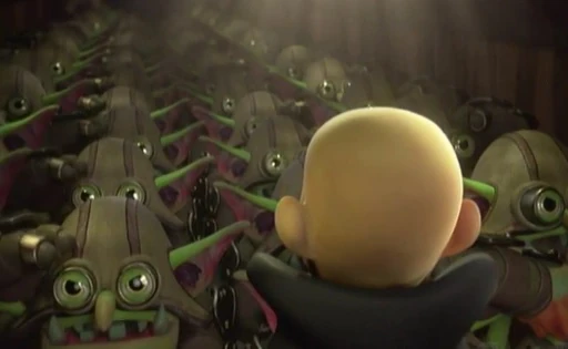 Still under his Weeruptor disguise, Kaos accompanied the other Minis through the tour of the Academy, nearly giving himself away by boasting about himself. He then tricked Hugo into taking him, Food Fight and the Minis to the Heroic Challenge Arena where he sprung a trap upon them with his Trolls who were disguised as the training dummies. Kaos took off his disguise and joined in on the attack, but was repelled by Food Fight and his tomatoes. He retreated by piloting an Arkeyan Copter that was parked outside of the Academy by Flynn and the others, vowing revenge, but was cut off by another one of Food Fight's tomatoes.