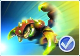 Scorp was raised in the Salt Flat Islands, an endless flat plain of rock where every day is very hot. To keep themselves entertained, the residents live for the sport of Sting Ball, an extreme game that only the strongest play to become King of Sting -- a title Scorp had won numerous times. During his last championship game, the opposing team cheated by using an enchanted water gem to make it rain. But the spell got out of control and soon a raging thunderstorm flooded the land. Using his powerful claws and incredible agility, Scorp bravely battled the rising waters to retrieve the gem and hurl it far into the clouds, breaking the spell and saving everyone. Seeing how his abilities could be used for more than sport, Scorp soon sought out and joined the Skylanders.