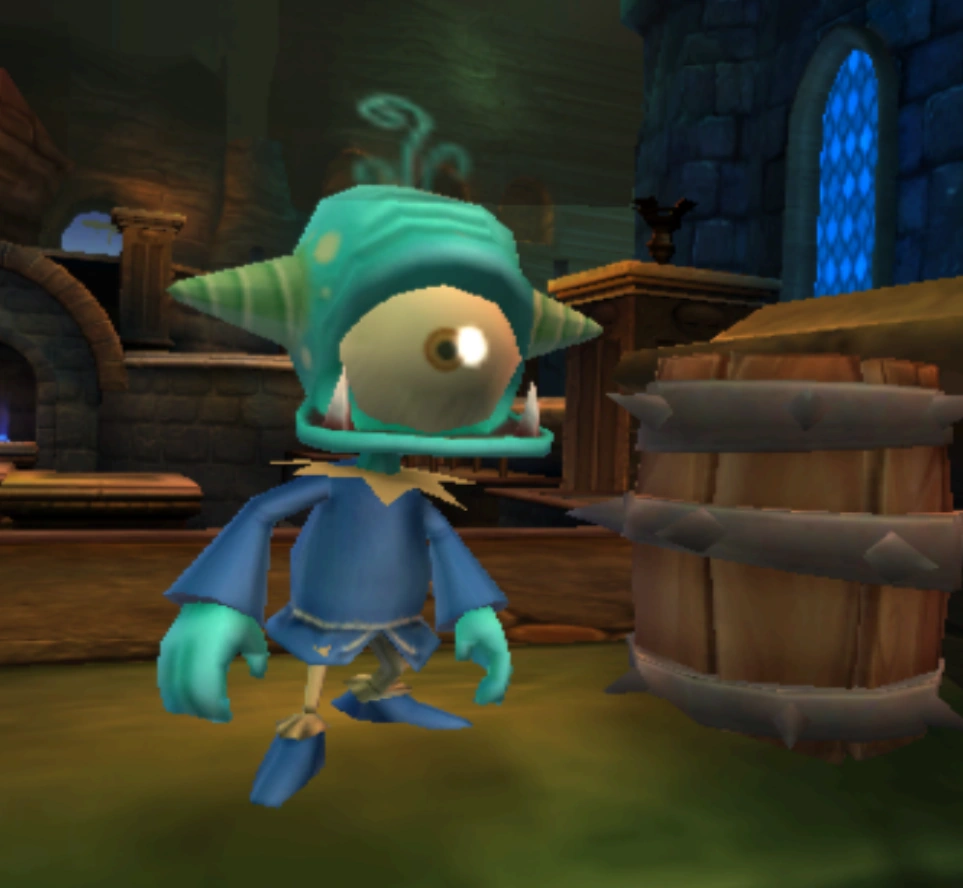 Timidclopses are small Cyclopses who are first encountered at Crystal Eye Castle in Skylanders: Spyro's Adventure. They attack the Skylanders by pushing explosive barrels down long ramps. As their name suggests, Timidclopses are very timid and easily frightened. If chased, some may even resort to jumping over ledges to escape, and others will hide behind barrels.