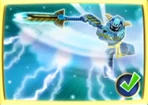 In Skylanders: Ring of Heroes, in his Awakened form, Wild Storm's steel features on his mask change their color to gold with a small addition of a cross on the mask's top. His horns pointing up gain steel rings. He wears blue-gold gauntlets with steel parts in the shape of claws covering his fingers, and spiked boots of the same color. Neither have strapped guards. Also, his tassets are shield-shaped, turn blue, and, which also applies to his gauntlets and boots, gain spikes. He loses his feather cape, and his sword's blade changes shape to a form similar to that of a fish's body.