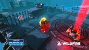 Using his father's Traptanium shield, Wildfire can use it as defense, protecting himself even from the Golden Queen's magic and burning enemies that approach, or as offense, bashing enemies with it. Wildfire can also summon chains of fire that pull enemies closer and breathe fire with a mighty roar, and temporarily destroy his shield to assume a quadruped stance for melee attacks.